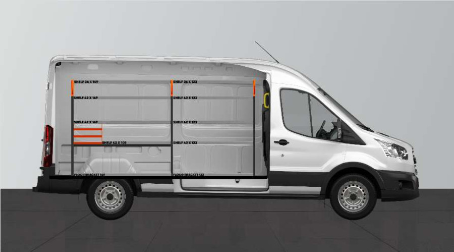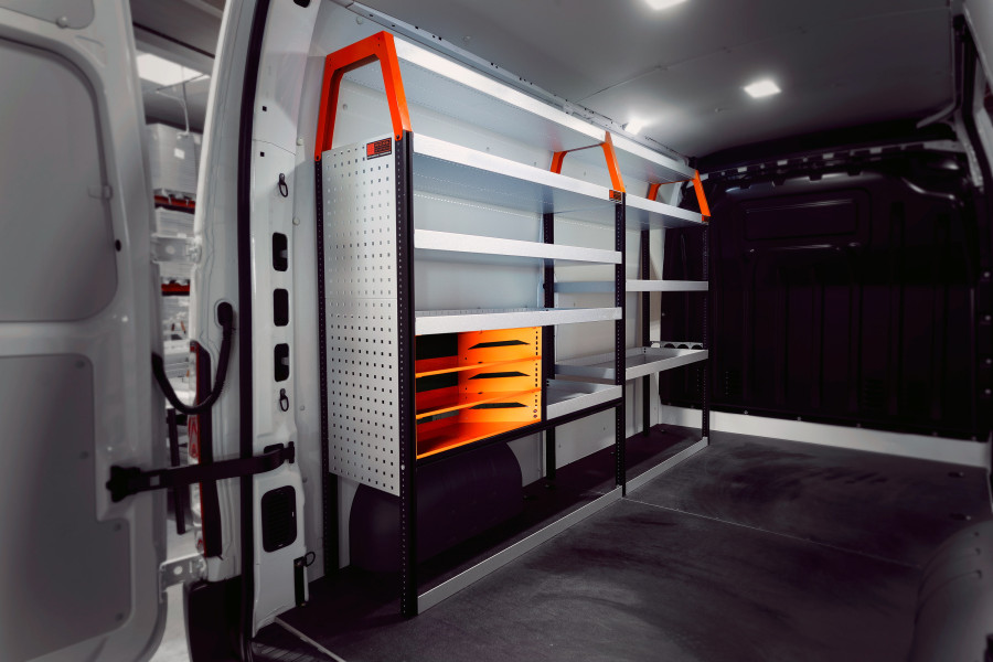 En populær innredning for deg som trenger gode oppbevaringsmuligheter til et mindre sortiment, verktøykofferter og maskiner. Denne serviceinnredningen inneholder 3 stk. sortimentholdere som er tilpasset markedets mest populære sortimentskuff, Racco Carrylight. Innredningen kan om ønskelig kompletteres med disse sortimentskuffene. Bilinnredningen passer perfekt til din Ford Transit L3H2.
