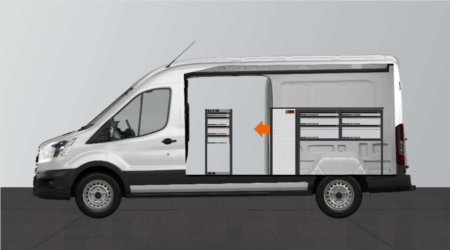 Bilinnredning med enkel tilgang til kulelagrede skuffer ved sidedøren i Talento, NV300 & Trafic L2.