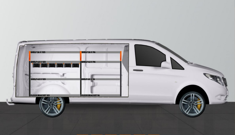 Bilinnredning med god lagringsplass i hyller og modulbokser. Passer til Mercedes Vito Ekstra Lang.